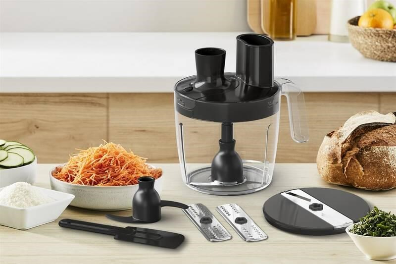 Tefal HB67G830 Quickchef+ 5v1 Black vám poskytne více nástrojů pro usnadní práce v kuchyni. Kompaktní sekáček slouží pro sekání a mletí. Se šlehací metlou zase připravíte lahodné krémy či domácí majonézu. Mixovat můžete pomocí Tefal HB67G830 v dodávané odměrné nádobě.