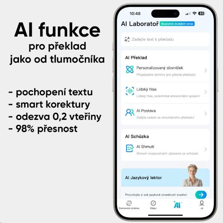 Funkce BoostClean pro izolaci šumu a 4kanálové zpracování TurboFast filtrují rušivé vlivy v reálném čase, umožňují okamžitou odezvu a zajišťují, že každé slovo zazní s křišťálovou čistotou. AI díky pochopení kontextu dokáže okamžitě rozeznávat podobně znějící slova a vyhne se tak nepříjemným chybám. Při rychlých projevech nebo živých prezentacích v práci identifikuje technologie Al sémantické segmantace přirozené pauzy v dlouhých projevech. Překlad začíná již po jedné větě, sleduje obsah konverzace a nerozhodí ji ani delší pauzy. Stejně jako lidský tlumočník. Vaše konverzace zůstanou přehledně uložené a vždy připravené k dalšímu využití. V aplikaci najdete i další funkce jako třeba vlastního jazykového kouče.