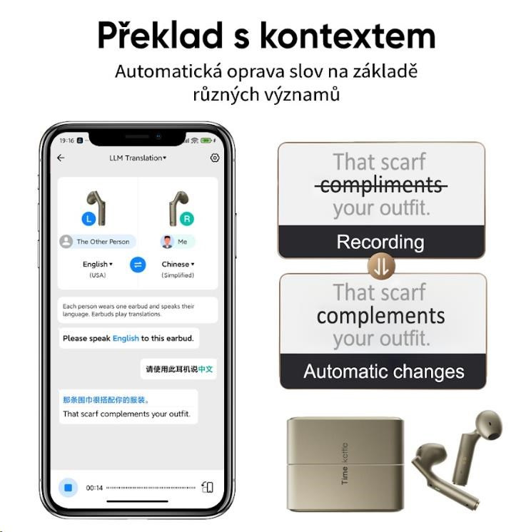 Překonejte jazykové bariéry v reálném čase s AI tlumočníkem a překladatelem Timekettle W4. Podporuje obousměrný překlad ve 42 jazycích a 95 dialektech, takže konverzace mezi různými kulturami je plynulá a přirozená. Ať už cestujete, pracujete nebo poznáváte nové lidi, W4 zajistí, že každé slovo bude správně pochopeno. Rozlučte se s trapnými pauzami a jazykovými nedorozuměními – stačí mluvit a AI se postará o zbytek. Komunikujte svobodně a sebevědomě kdekoliv na světě bez jazykových omezení. Přesnost překladu je až 98% a AI slovník na principu velkých jazykových modelů (LLM) zajistí díky perfektnímu porozumění přesnou opravu podobně znějících slov a celkovému porozumění kontextu konverzace. Aplikace Timekettle vám navíc z konverzací vytvoří přepis a AI shrnutí.
