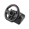 Součástí zařízení je manuální převodovka a modul s pedály – plynem, brzdou a spojkou, které společně vytvářejí autentický pocit řízení jako ve skutečném voze. Díky perforovanému gumovému povrchu volant skvěle padne do ruky a při rychlých manévrech neklouže. Pro ještě větší pohodlí je možné zařízení připevnit pomocí přísavek, což zajistí stabilitu i při intenzivním hraní. Tlačítka pro ovládání a 8směrný analogový D-pad jsou chytře umístěné přímo na volantu pro okamžitou reakci během závodu.