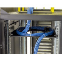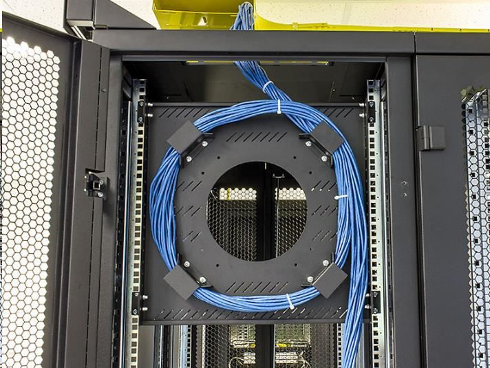 Držák je možno instalovat ve svislé poloze (10U) na 19“ vertikální lišty (obvykle na zadní stranu rozvaděče), nebo po otočení úchytů vodorovně mezi vertikály podobně jako klasickou polici. Nosné trny namontované kolem středového otvoru zajišťují poloměr ohybu uložených kabelů a brání jejich poškození.