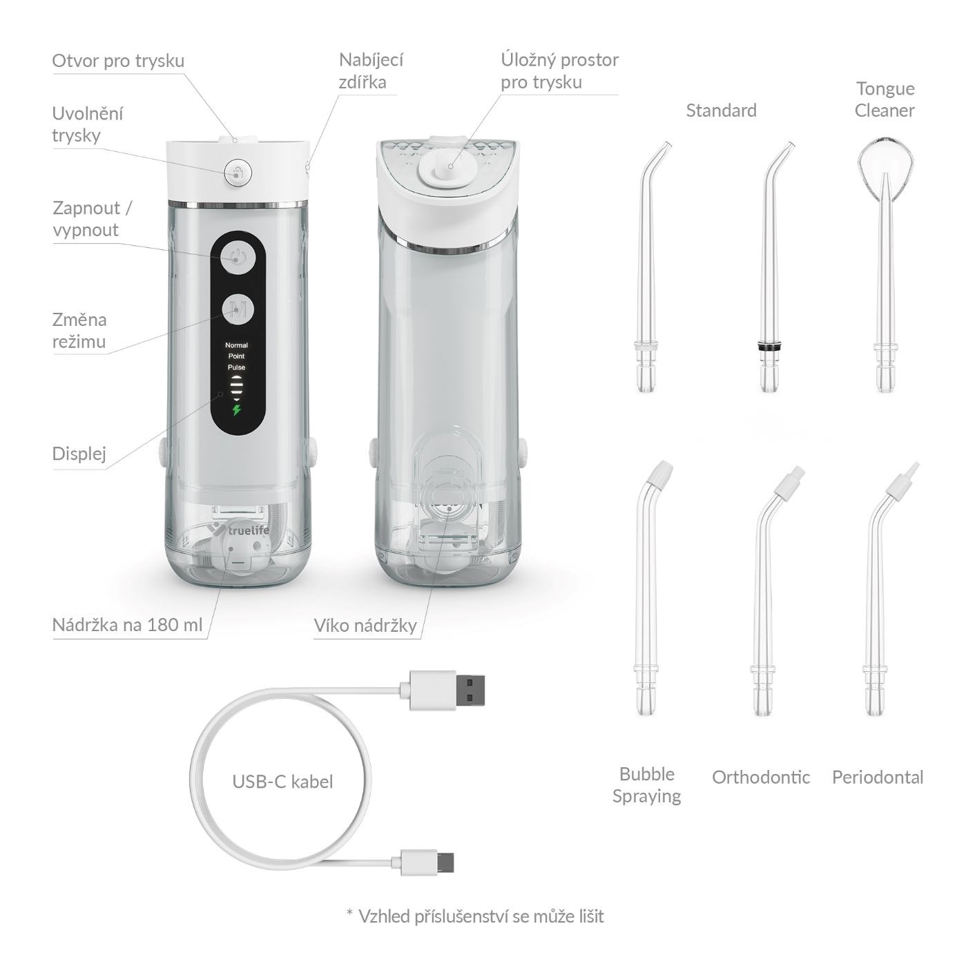 Doslova rájem pro bakterie jsou v ústní dutině mezizubní prostory. Chránit zuby před zubním kazem můžeme důkladným čištěním i těchto těžko dostupných míst. Ústní sprcha TrueLife AquaFloss Mini M50 je praktickým a komfortním pomocníkem. Poskytuje maximálně efektivní řešení díky 3 režimům čištění se 4 intenzitami tlaku pro každý z nich a technologii StreamTrue®, která odstraní až 99 % plaku a nečistot. Technologie PulseTrue® příjemně masíruje dásně a přispívá k jejich regeneraci. Funkce paměť si zapamatuje poslední použitý režim. Sprcha je nově vybavena také jedinečnou tryskou Bubble Spraying s technologií, jež rozpráší vodu po celé ploše zubu. Nádržku o objemu 180 ml snadno naplníte 3 různými způsoby a hlavice otočná o 360° je zárukou, že se dostanete do každého zákoutí. Ústní sprcha je skvělá na doma, ale i na cesty díky teleskopickému tělu, koženkovému pouzdro, možnosti uschovat trysku v horní části sprchy a výdrži baterie 12 dní.