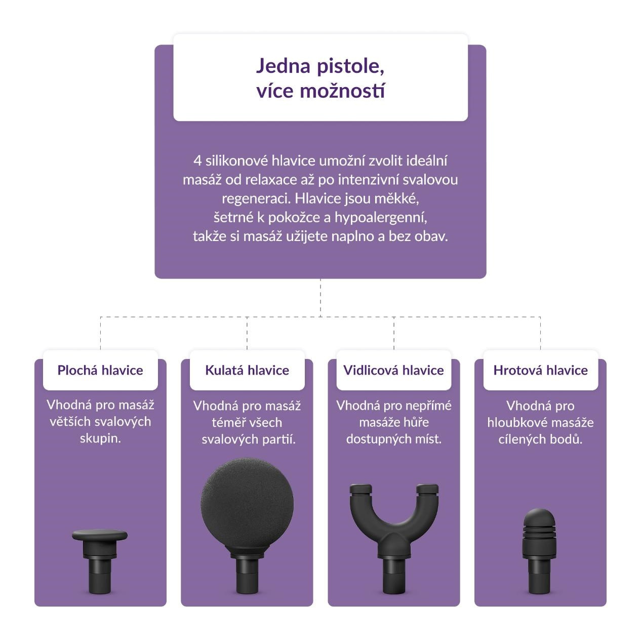 Každý sval si zaslouží speciální péči, proto je masážní pistole TrueLife RelaxGun G1 vybavena čtyřmi vyměnitelnými silikonovými hlavicemi. Kulatá hlavice je univerzální volbou pro velké svalové partie a využijete ji jak před tréninkem, tak i po něm. Plochá hlavice díky svému rovnoměrnému tlaku skvěle poslouží k jemnému uvolnění svalů v blízkosti kloubů a kostí. Pro šíji, páteř nebo lýtka zvolte vidlicovou hlavici, která je ideální pro nepřímou masáž hlubších vrstev svalů. Naopak při potřebě přesné bodové masáže citlivých nebo těžko dostupných míst využijete hrotovou hlavici.