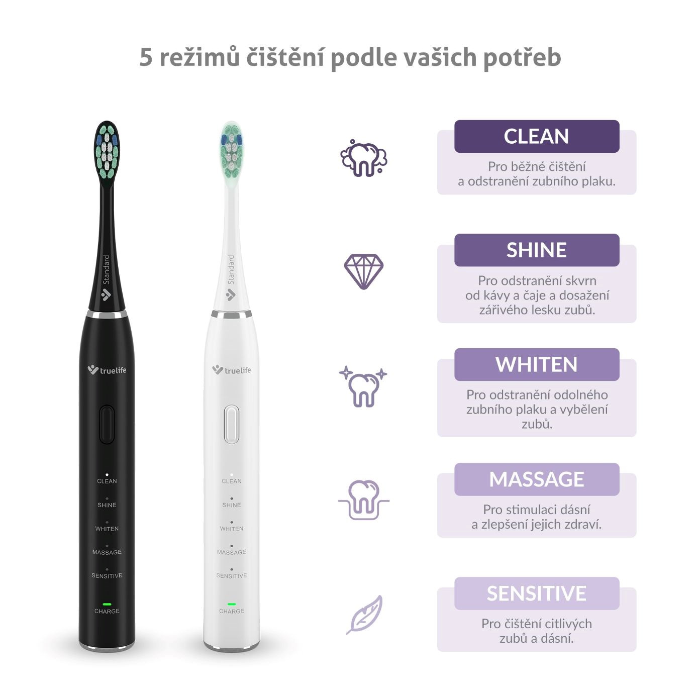 Oba kartáčky disponují 5 režimy pro péči o zuby a dásně. Clean se hodí pro standardní čištění a odstranění plaku, Shine zajistí zářivý úsměv a odstranění pigmentových skvrn, Whiten vybělí, Sensitive je určen citlivým zubům a dásním, Massage pak dásně stimuluje a prospívá jejich zdraví.