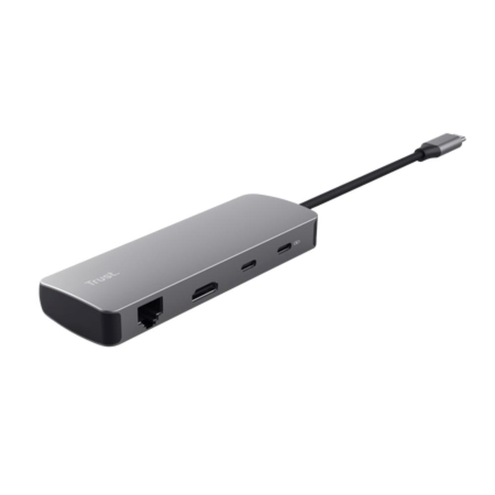 Stylový hliníkový multiportový adaptér pro přidání portů HDMI, sítě, čtečky karet, USB-C a USB k notebooku pomocí jediného připojení USB-C.