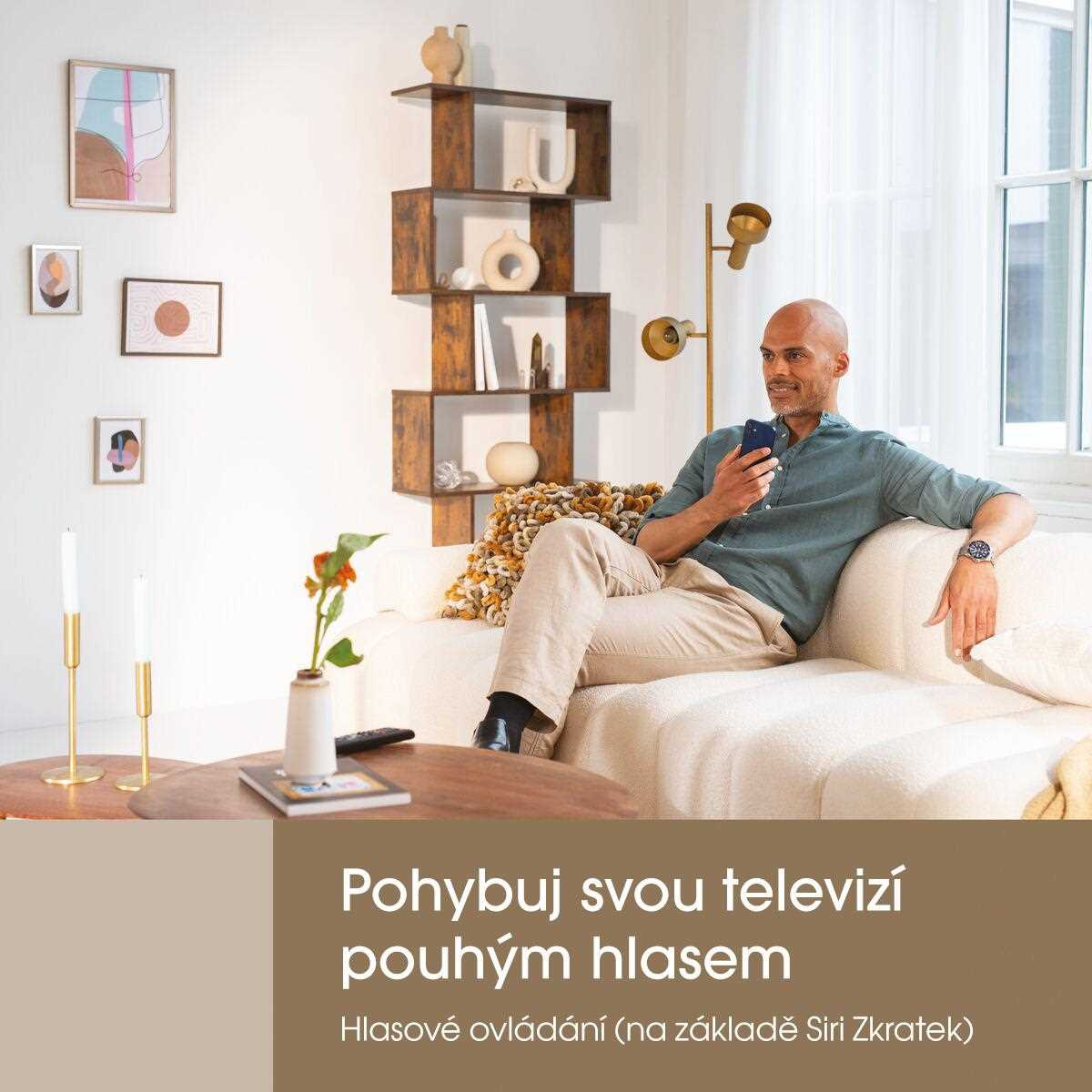 Nemusíte vstávat z pohodlného křesla. Jakmile televizor zapnete, držák se automaticky natočí do přednastavené polohy. Chcete natočit obrazovku? Pomocí hlasu (hlasové ovládání Siri, založené na zkratkách Siri) přesuňte obrazovku do jedné z vašich předvolených pozic. Nebo držák snadno ovládejte pomocí dálkového ovladače nebo prostřednictvím zdarma stažitelné aplikace MotionMount v telefonu nebo tabletu (iOS nebo Android). Celkem můžete vytvořit a nastavit 7 různých preferovaných pozic.