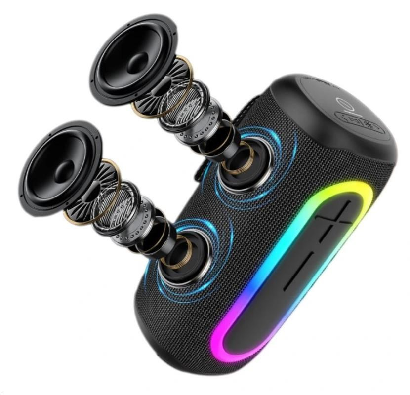 - Vícebarevné LED osvětlení: Reproduktor má možnost měnit barvy LED světel, což vytváří skvělou atmosféru při přehrávání hudby.