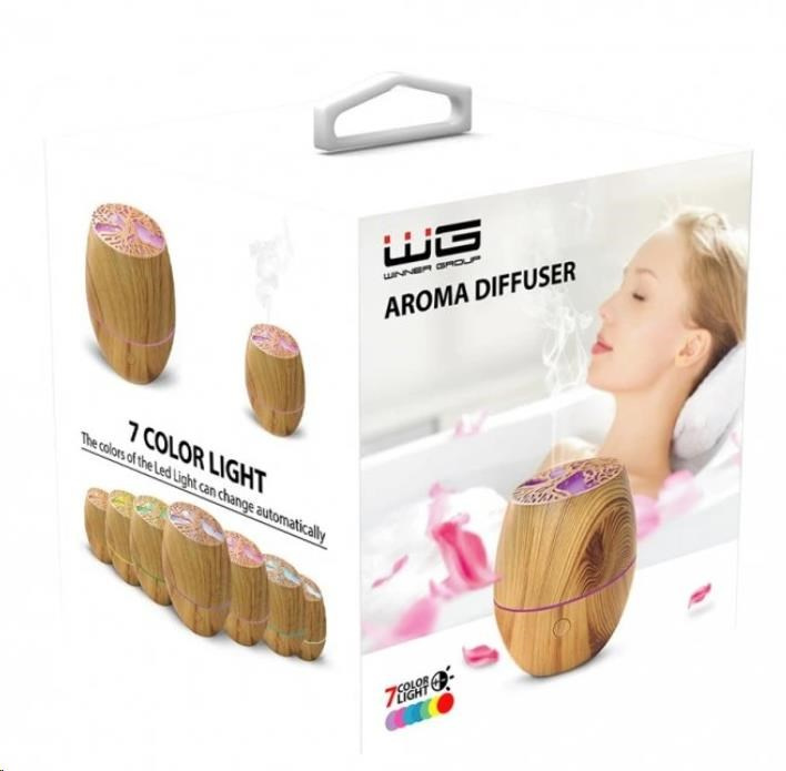 Ultrazvukový difuzér zvlhčující vzduch s aroma funkcí a vestavěnou lampou, poskytující světlo v jedné ze sedmi barev nebo v harmonicky se měnících barvách, pomáhá obnovit vhodnou vlhkost ve vysušených místnostech, přičemž vydává chladnou mlhu; možnost přidání silic, dobře se osvědčuje v aromaterapeutických salónech, protože silice příznivě působí na organismus a nervový systém. Tichý provozní režim. Zpoždění vypnutí: 1 - 2 - 3 hodiny, poté se zařízení automaticky vypne. 120ml nádržka na vodu