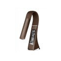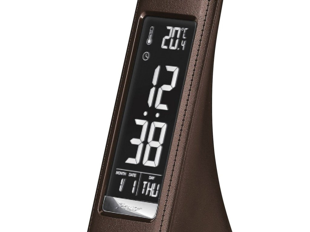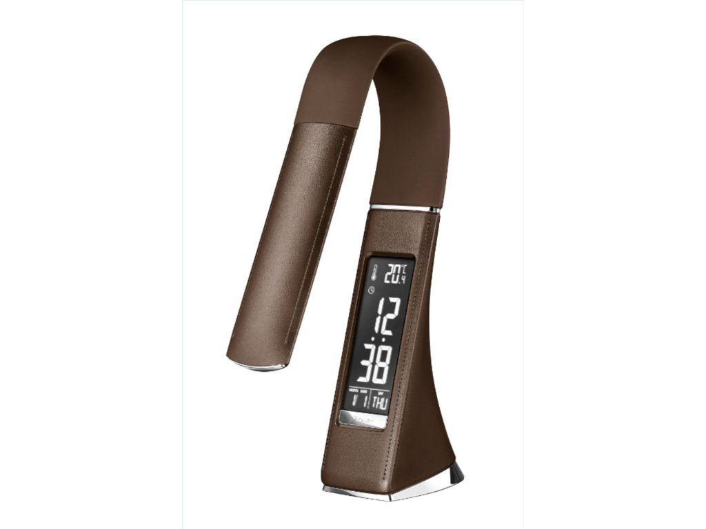 Kožená stolní LED lampa hnědé barvy s ohebným ramenem, které zajistí osvětlení požadovaného místa. Rovnoměrné a jemné světlo, které šetří oči. Nastavitelný jas ve třech úrovních. Citlivý dotykový panel pro snadné ovládání. Součástí lampy je displej s vysokým rozlišením, kterým zobrazuje hodiny, budík, kalendář, teplotu.