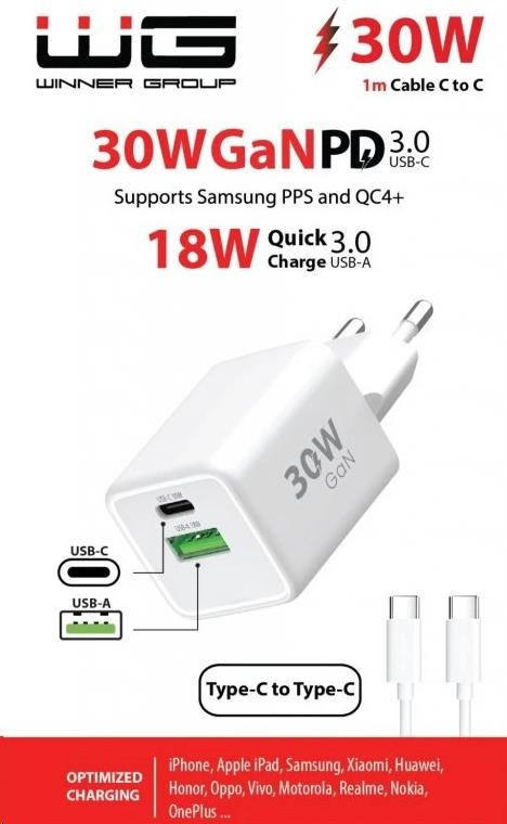 Síťová nabíječka GaN 30W je kompaktní, výkonná a odolná proti přehřívání. Díky duálnímu výstupu USB-C a USB-A nabízí široké možnosti využití pro smartphony, tablety i další elektroniku.