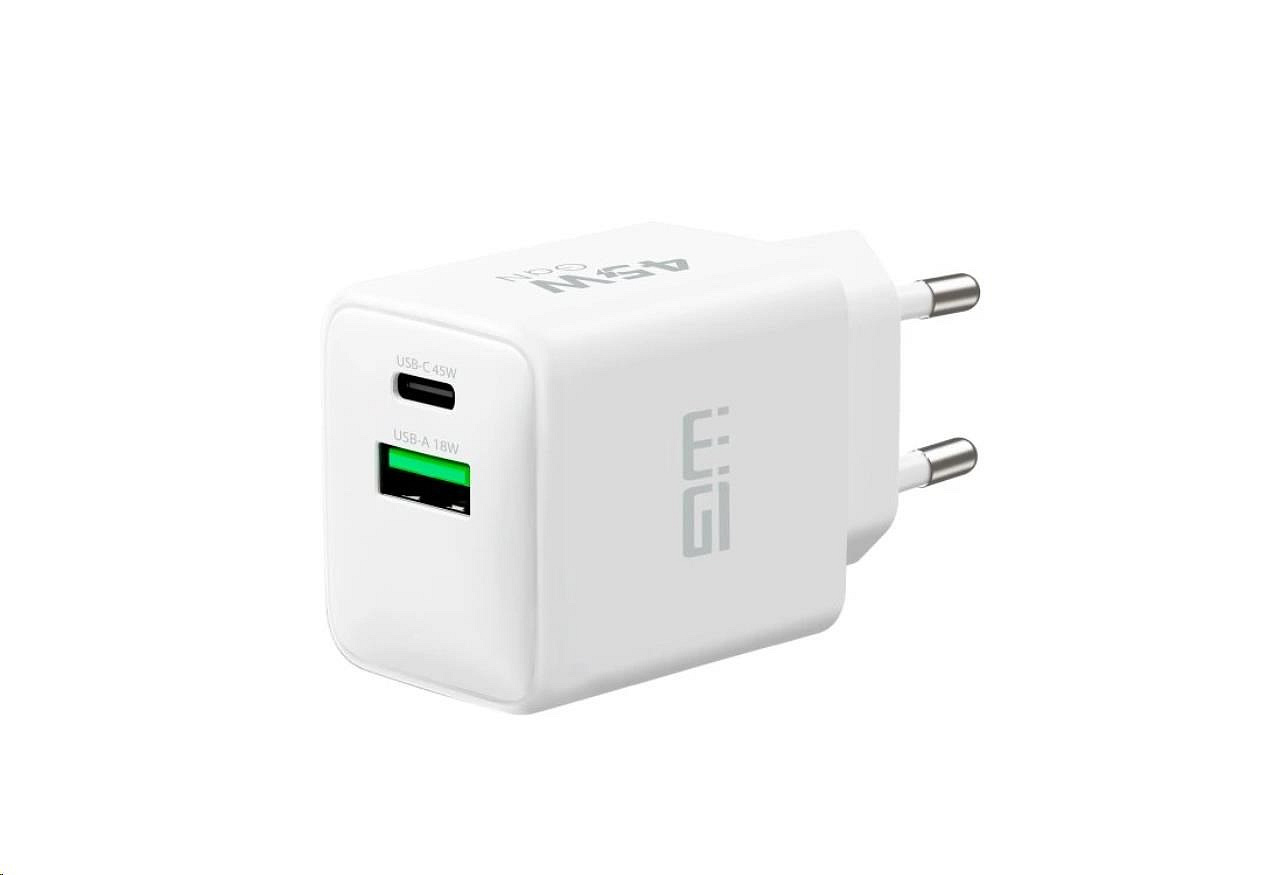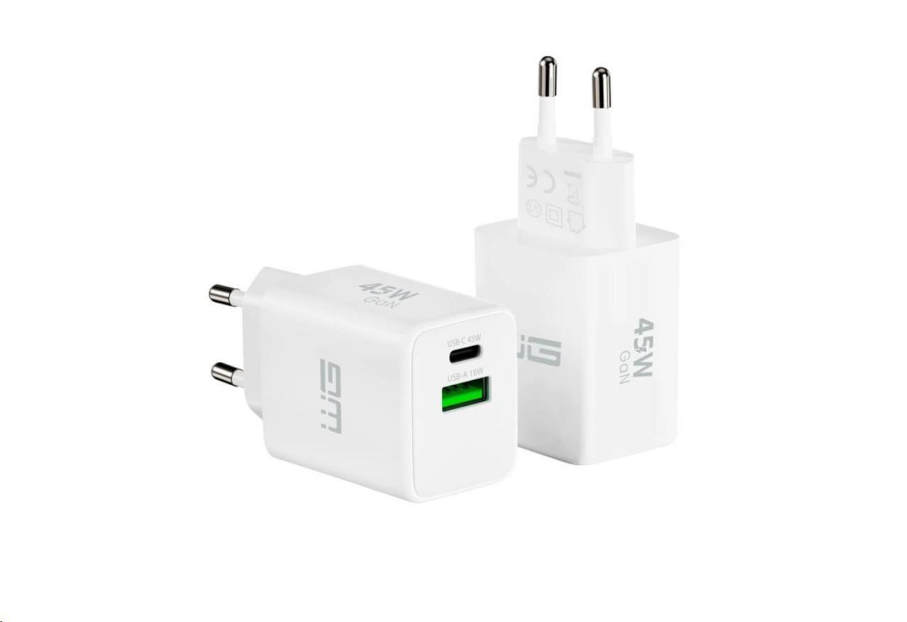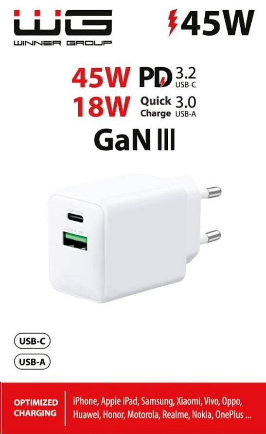 Popis WG Síťová nabíječka GaN 2xUSB (A+C)/USB-C PD45W+USB-A QC3.0 18W/white
