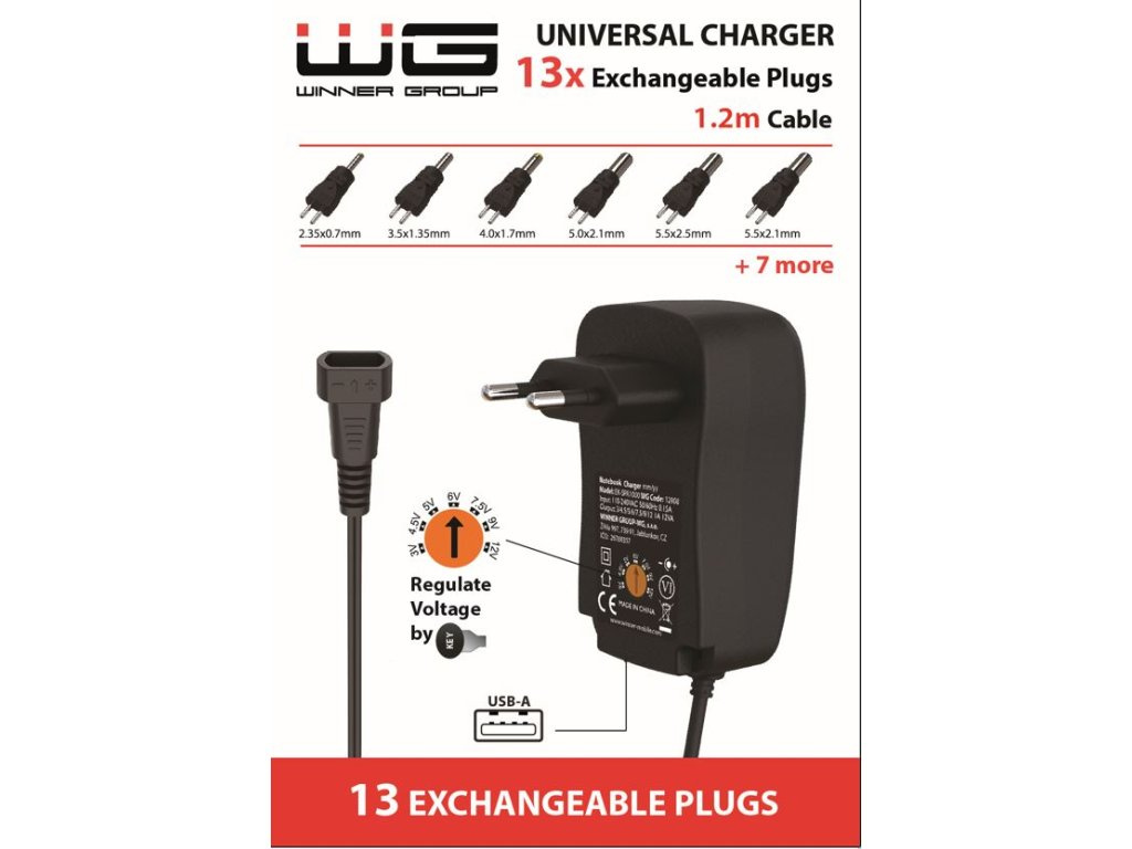 Vyměnitelné koncovky: 2.35 x 0.7mm, 3.5 x 1.35mm, 4 x 1.7mm, 5 x 2.1mm, 5.5 x 2.5mm, 5.5 x 2.1mm, Jack 2.5mm, Jack 3.5mm, Micro 5P, 2.5 x 0.7mm, 3 x 1mm, 4.8 x 1.7mm, 5.5 x 1.5mm.